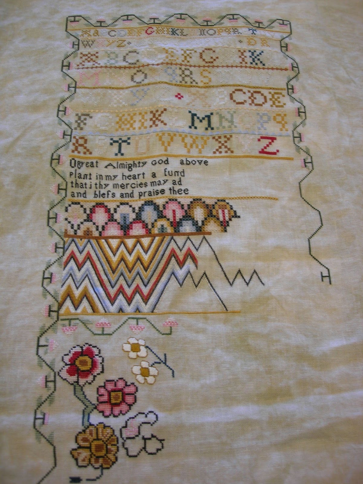 I've had a finish! Miriam Chilvers' Sampler by Samplers Remembered. Stitched on 40 count Lakeside using the called-for AVAS.