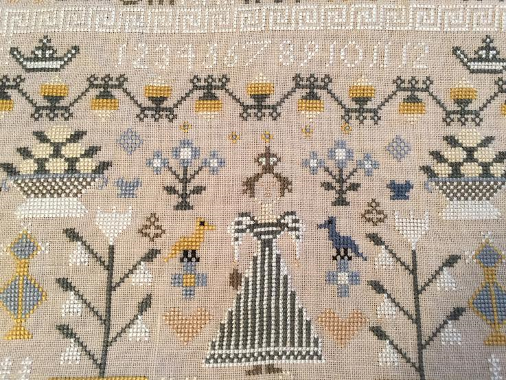 I spent some time with Mariam Chilvers Sampler 1833. I got interested in her leg-o-mutton sleeves, which apparently during the early 1800s were a thing. I did a little research into it (can't remember what site or I'd link to it), and it seems that the sleeves got larger and larger until they had to be stuffed with cotton or other materials to keep them properly poofed, and a lady entering a room might have to turn sideways because the sleeves wouldn't allow her to go through the doorway.