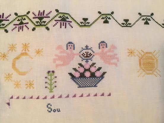 I didn't find the Wisper because I found this chart instead. I started it some time back. This is Miriam Chilvers' Sampler 1833, by Samplers Remembered. I originally started her in 2010--time for her to be off my q-snaps and framed. I don't generally imagine what a frame should look like in advance, but I'm thinking something in the gray blue color of some of the motifs.